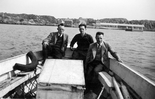 Ar an bhád ó Ailt a’ Chorráin go hÁrainn Mhór 5/5/1953. Seán Ó hEochaidh (An Coimisiún Béaloideasa) Phil Ó Baoill (Oileánach) agus Jimmy Mahon (innealtóir fuaime le RÉ).
