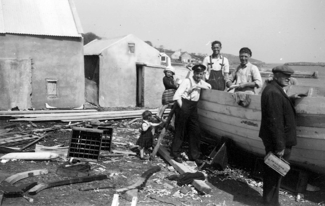 Fir agus páistí ag obair ar bhád ar Árainn Mhór Mí Bealtaine 1953.