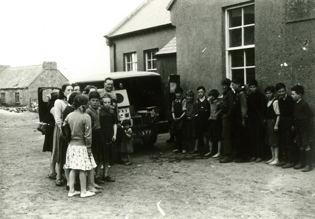 Jimmy Mahon (RÉ) agus páistí scoile ag Scoil Athphoirt, Árainn Mhór Mí Bealtaine 1953.