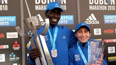 Pictured below: Moses Kibet of Kenya and Tatiana Aryasova of Russia display their Dublin City Marathon trophies.