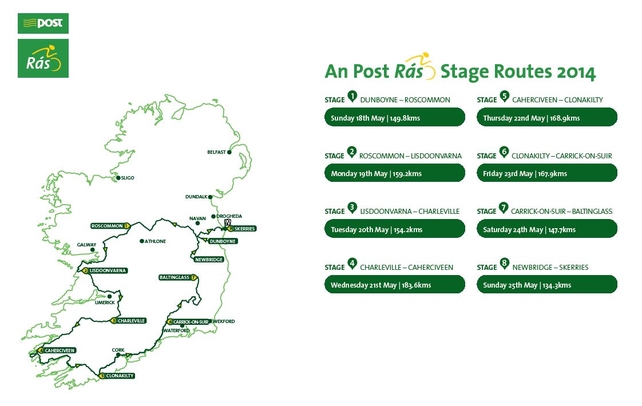 The 2014 An Post Rás will take an anticlockwise route around Ireland, beginning on Dunboyne on Sunday 18 May and featuring stage-end finishes in Roscommon, Lisdoonvarna, Charleville, Cahirciveen, Clonakilty, Carrick on Suir, Baltinglass and Skerries.