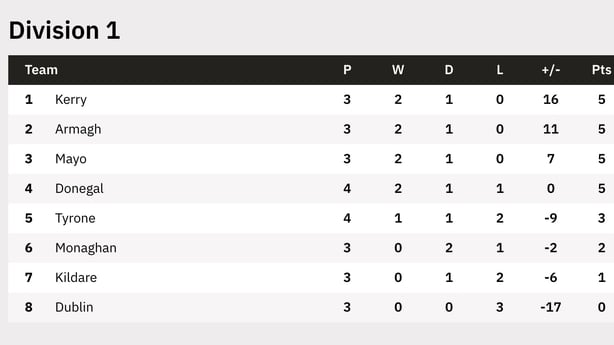 The other winless team in the top flight are Monaghan, though their two draws has them in a slightly healthier position. They welcome the Kingdom to Inniskeen on Sunday afternoon, with Jack O'Connor's side leading the way in Division 1 on points difference from Tyrone and Mayo.