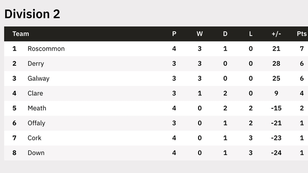 The battle to avoid the drop to Division 3 and the inaugural Tailteann Cup has taken a clear pathway, with Down, Cork, Meath and Offaly winless and facing some crunch fixtures.