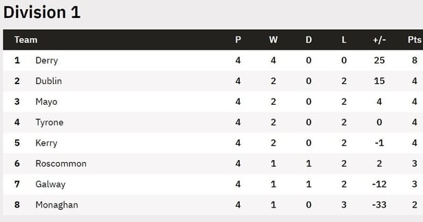 On Sunday, TG4 will screen the Division 1 double of Kerry v Tyrone (1.15pm) and Monaghan v Galway (3.15pm). The Division 2 fixture between Cork and Kildare (3.30pm) will be on the TG4 app.