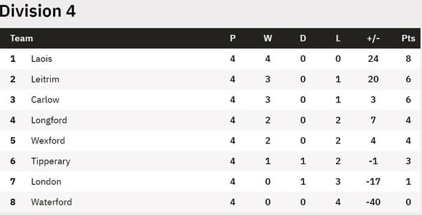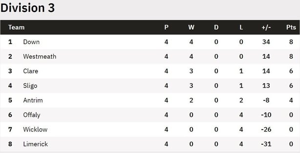 While it’s not unusual to see two teams – in this case Down and Westmeath – with full points after four rounds, the fact that three teams remain on zero points at this stage is most unusual.