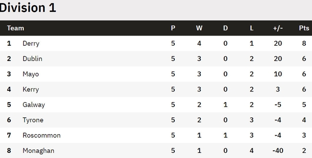 As for the Kingdom, they will still harbour ambitions of making a league final. Level on points with Dublin and Mayo on 6, with Derry leading the way on 8, it's looks like two from the quartet will make the decider on Easter Sunday.