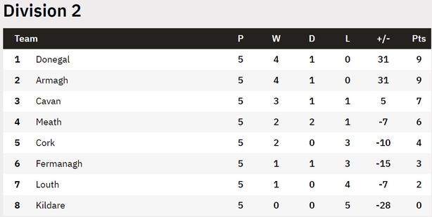 At the other end of the table, a win against Kildare would all but guarantee Donegal (9) promotion given that Armagh (9) and Cavan (7) are still to meet. There is a scenario where all three end on 11 points and scoring difference could come into play.