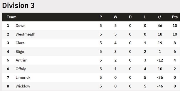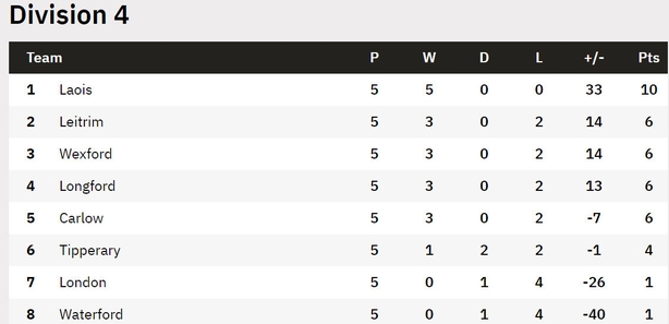 Behind them is where things are interesting. Four sides: Leitrim, Wexford, Longford and Carlow - all on six points - all still in the mix. Carlow's scoring difference is in negative figures, though.