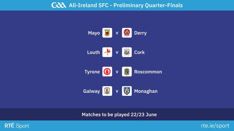 The draw for the All-Ireland SFC preliminary quarter-finals - Mayo meet Derry in MacHale Park in the most high profile tie https://t.co/zRb07hyC4g pic.twitter.com/bGPygOwJUm