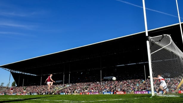 Footballer of the Year Paul Conroy was a central figure in Galway’s first-half blitz, shooting three superb two-pointers (one from a free) with Matthew Tierney, Cillian McDaid, Seán Kelly and Rob Finnerty all raising white flags. Galway’s goal came from a Matthew Tierney penalty on 27 minutes and put them firmly in the driving seat, leading by eight points.
