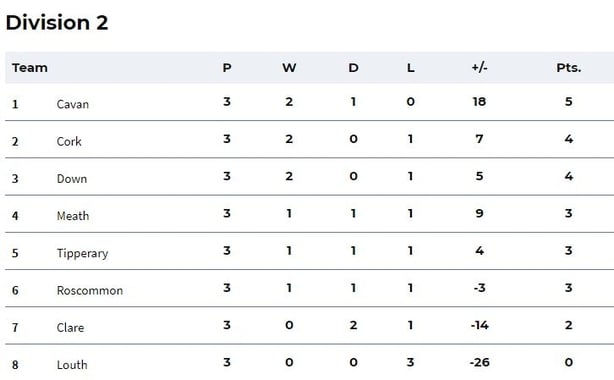 Down (four points) have a chance to move into the top two when they host Clare (two points) in Newry. Clare, who have drawn two of their opening three games, won the corresponding tie by six points last year.