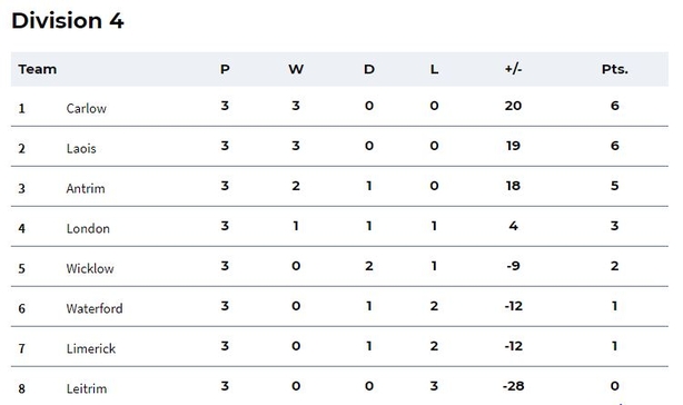 Laois, the Division’s top scorers on 5-46 (61 points), head for Aughrim to take on Wicklow, who have yet to score a goal (0-34).