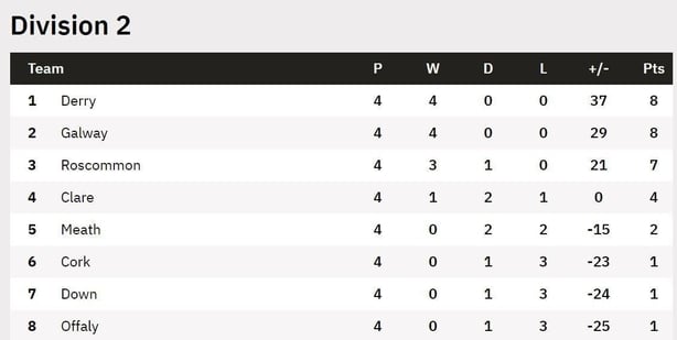And Derry have eased away from their rivals so far. Roscommon will present a tougher examination at the Hyde. A point dropped at home to Clare the only blemish for Anthony's Cunningham's so far. That yet could be costly if Rory Gallagher's men are too good for them.