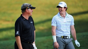 1500 All smiles for Rory McIlroy (level) and Darren Clarke (+9) with another par score, this time at the par-four 14th.