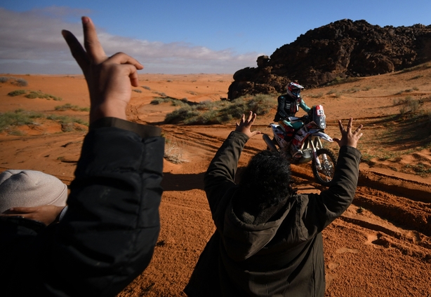 Australian Daniel Sanders, riding for the GasGas team and complaining of arm pain, led the motorcycle category by three minutes and 33 seconds from American Skyler Howes.