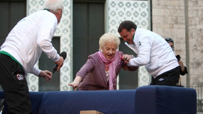 A concerned Trapattoni leapt to her aid and hauled her to her feet, before happily posing for a photograph and sending her on her way.