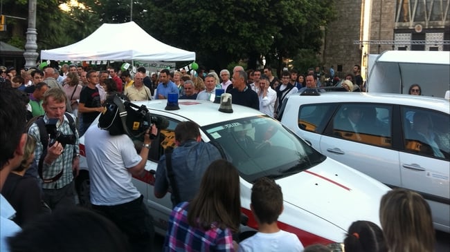 The scrum then made its way to a police car waiting to take the two men to the second part of the ceremony further up the town.