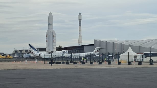 I met the pair outside the International Broadcast Centre (IBC), the hub just beyond the Stade de France, in Le Bourget, that houses the world's broadcast media operations. It's a massive complex. To enter, you have to pass through something similar to airport security. Also, in the distance is what looks like two space rockets.