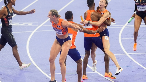 Meanwhile, Femke Bol ran a stunning last lap to lead the Netherlands (above) to victory in the 4x400m mixed relay, crossing the line in a time of three minutes 7.43 seconds.