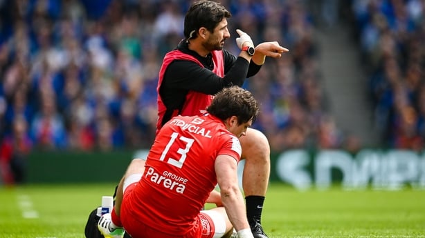 Having gone with a 6:2 split on the bench, it left Toulouse with scrum-half Graou and wing Arthur Retiere as the backline replacement options. An early backline injury will always test out the 6:2 split, and so it came to pass; outside centre Barassi (below) limped off after 14 minutes.