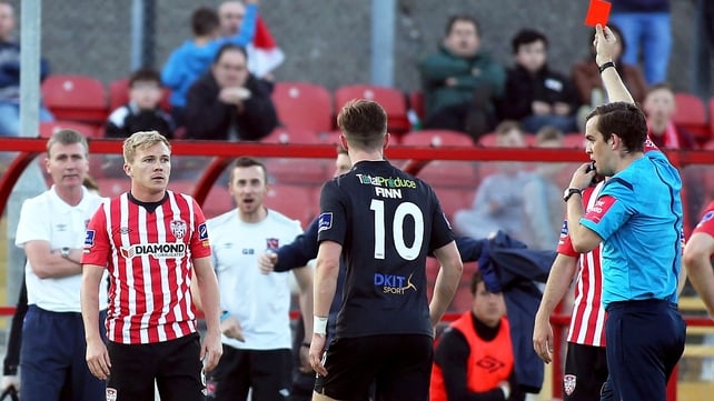 On 24 minutes, City went a man down when McCormack was shown a straight red card after a heavy challenge on Gannon and referee Robert Harvey also dismissed assistant manager Paul Hegarty from the Derry bench, as he took his protests too far.