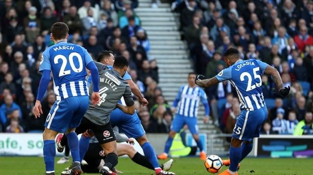 Centre-back Connor Goldson headed home Markus Suttner's corner to put the Premier League outfit into a 2-0 lead at the break before Leonardo Ulloa scored his first goal for Brighton since rejoining the club on loan from Leicester with a powerful header in the 61st minute to move 3-0 up.
