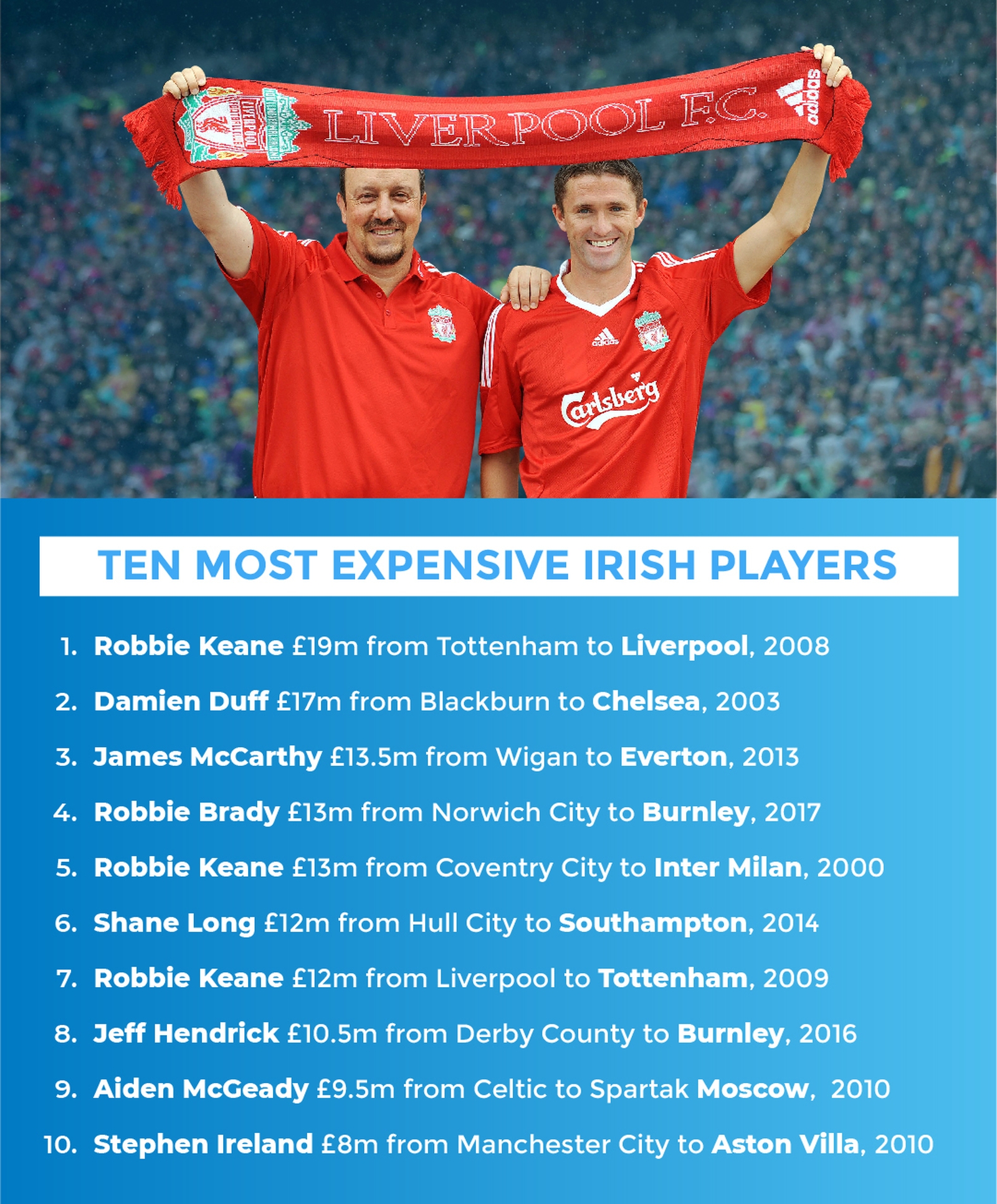 Robbie Keane's switch from Tottenham to Liverpool in 2008 for £19m remains the highest price ever paid for an Irish player and while the move ultimately didn't pan out for anyone apart from Spurs, who bought Keane back six months later for £7m less than they sold him, it's still the high-water mark for a transfer involving an Irish player.