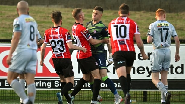 With 10-man Shamrock Rovers comfortably beating Dundalk at Tallaght, Derry needed a goal to avoid dropping into second place and it almost came from an unlikely source, with Ciaran Coll meeting Duffy’s free kick, but Kearns tipped the defender’s header over the bar.