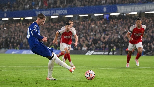They took the lead after 14 minutes. Sterling crossed from the right into the six-yard box, and as William Saliba leapt with an arm raised, Mudryk's header cannoned off it from close range. It took several minutes for referee Chris Kavanagh to be called to the pitchside monitor, but once checked there was little delay in awarding a penalty.