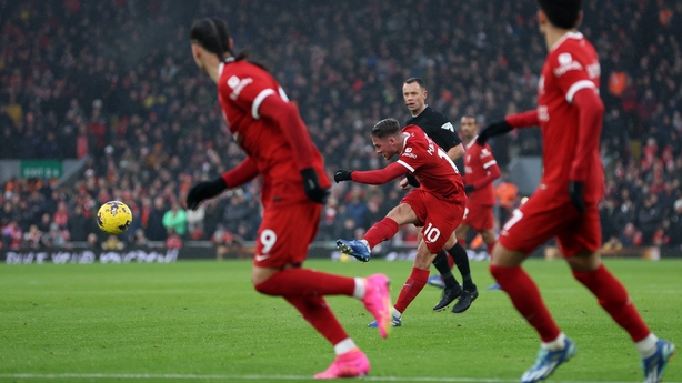 The Argentina international allowed the ball to bounce across his body before unleashing a rising drive which found the top corner, his first Liverpool goal and a worthy 500th at Anfield under the management of Klopp.