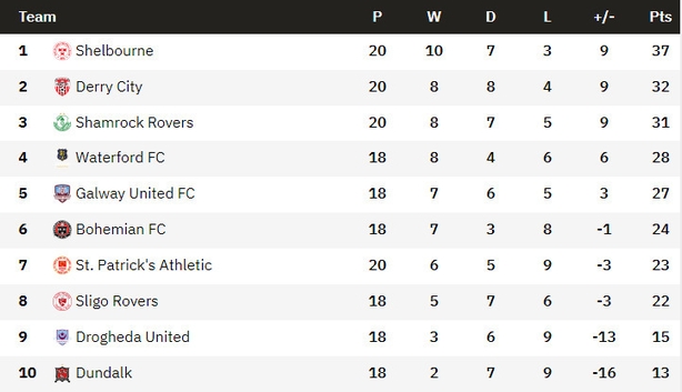 Shels lead at the top was only cut to five points after Derry's draw at Dundalk but Shamrock Rovers are back within six following their win in Drogheda.