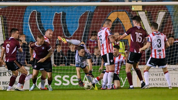 Derry rallied immediately. Paul McMullan caused havoc down the right and delivered in for Danny Mullan, whose close-range header was read by the wily Brendan Clarke.